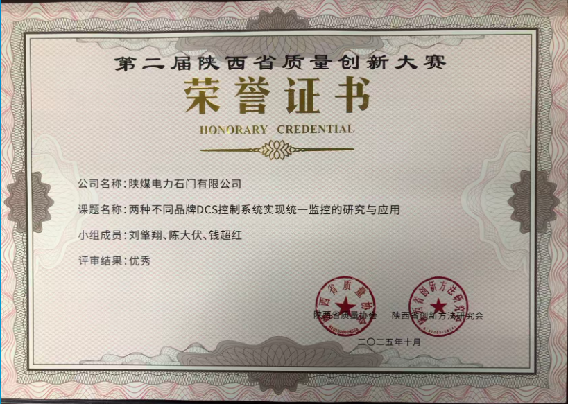 近日,在第二屆陜西省質(zhì)量創(chuàng)新大賽中,陜煤電力石門有限公司申報(bào)《兩種不同品牌DCS控制系統(tǒng)實(shí)現(xiàn)統(tǒng)一監(jiān)控的研究與應(yīng)用》榮獲優(yōu)秀獎。《...